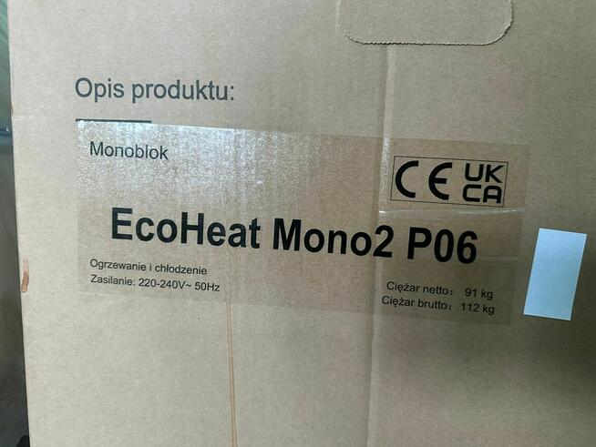 Nowy, fabrycznie zapakowany monoblock pompy ciepła EcoHeat Mono2 P06. Urządzenie zasilane napięciem 220-240V, 50Hz. Waga ...
